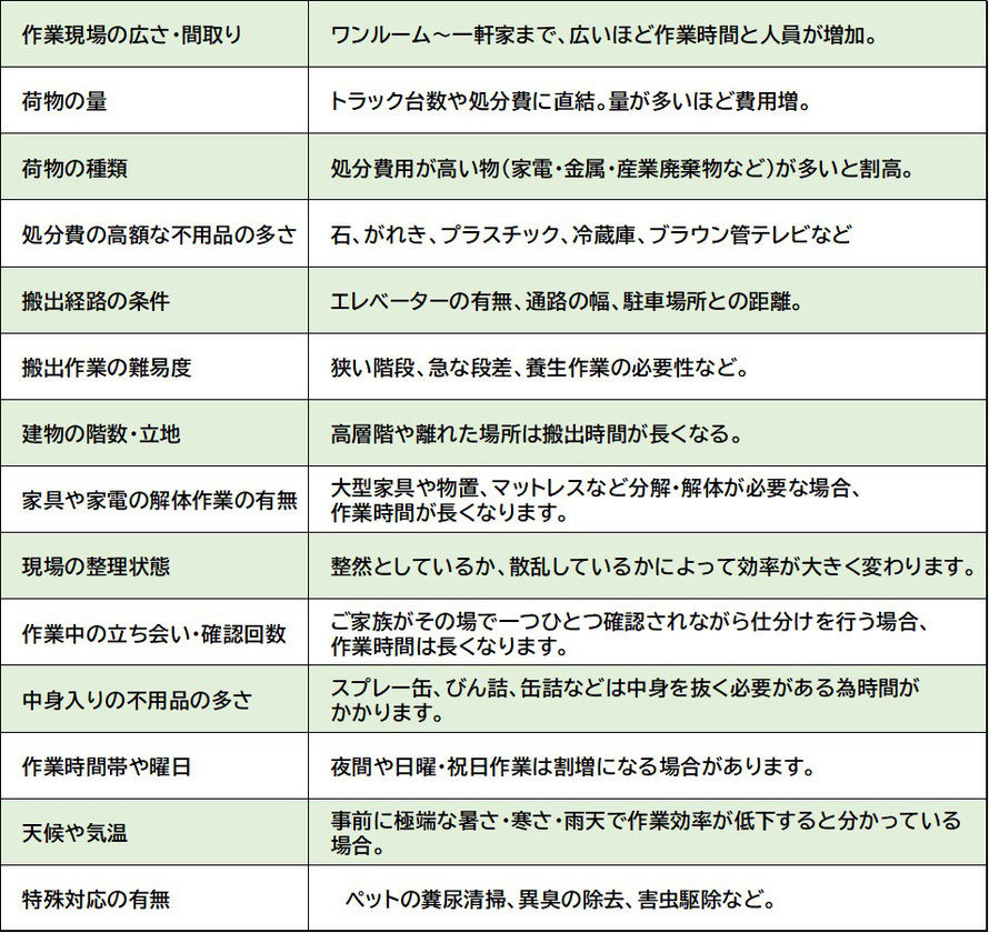 これらの条件により、同じ量の荷物でも作業負担や処分コストが大きく変わります。