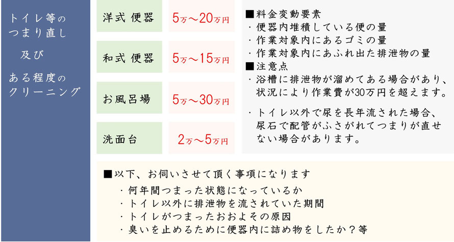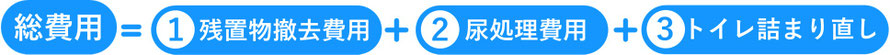 お部屋の状況や尿入りペットボトルの状態、トイレの状態によって必要な作業が大きく異なり、以下の3つの費用の合計が最終的な料金となります。
