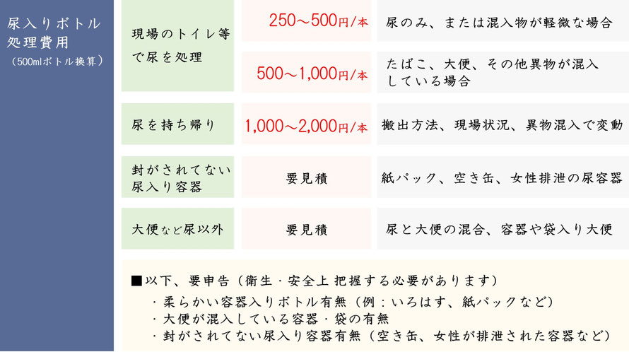 またトイレが詰まっていたり、現場が会社の寮にあるなどケースによっては尿をその場にあるトイレに流すことが困難であったりする場合も料金は上がります。
